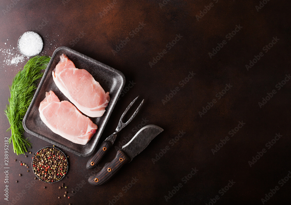 Raw pork loin chops in plastic tray with knife and fork on rusty background. Salt and pepper with fresh rosemary. Space for text