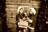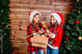 Merry Christmas and Happy Holidays. Cute little sisters decorate the tree at home.