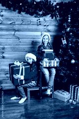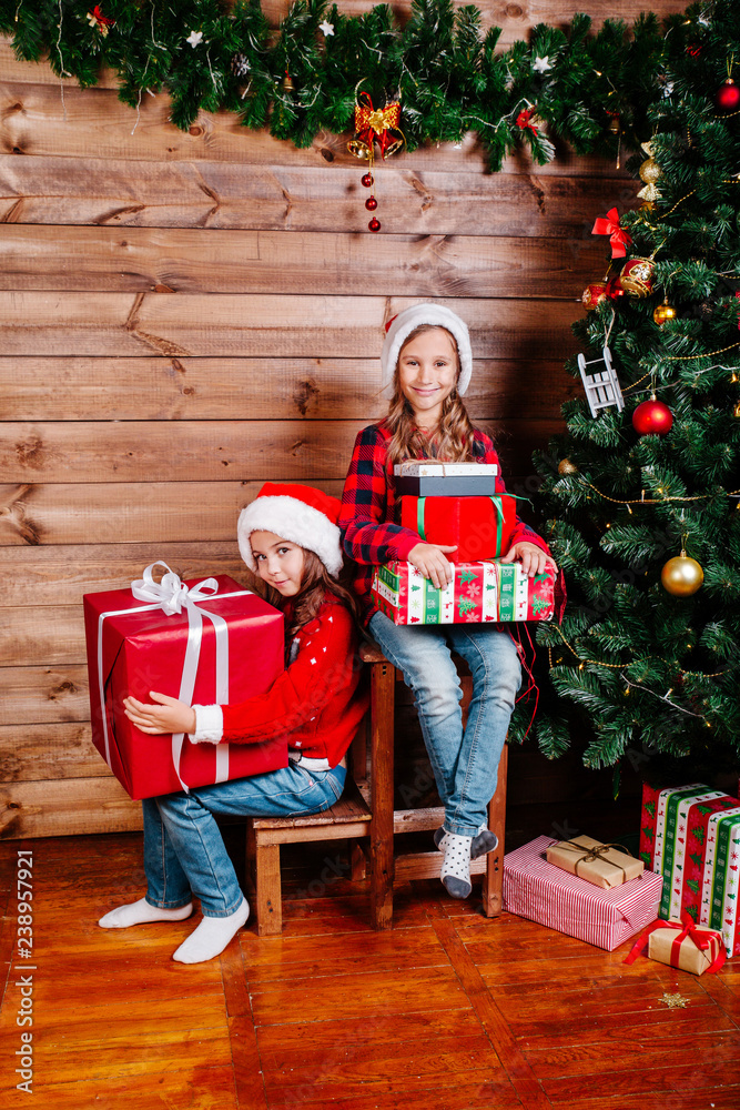Merry Christmas and Happy Holiday. Two cute little child girls with present gift boxes near tree indoor