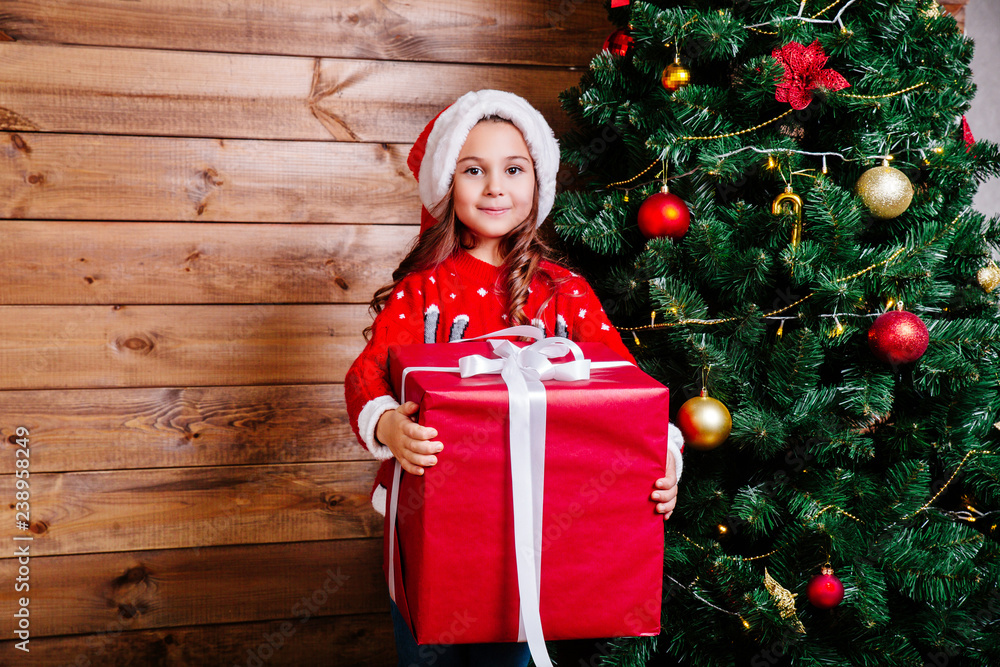 Merry Christmas and Happy Holiday. Cute little child girl with big red present gift box near tree indoor