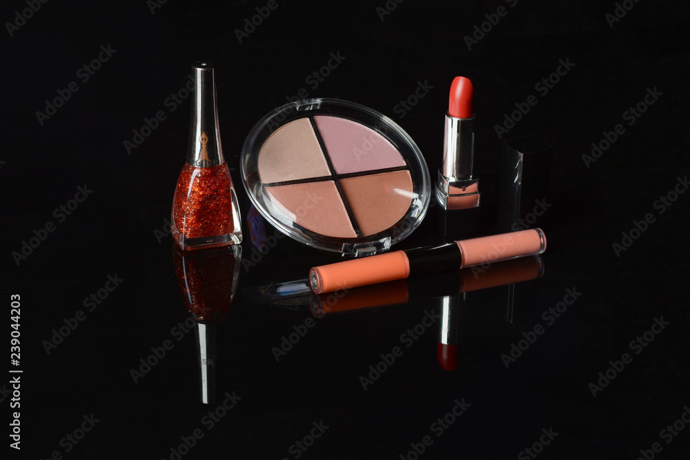 Makeup material brush and cosmetics on black background