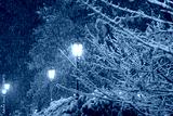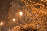 city park lantern during snow fall