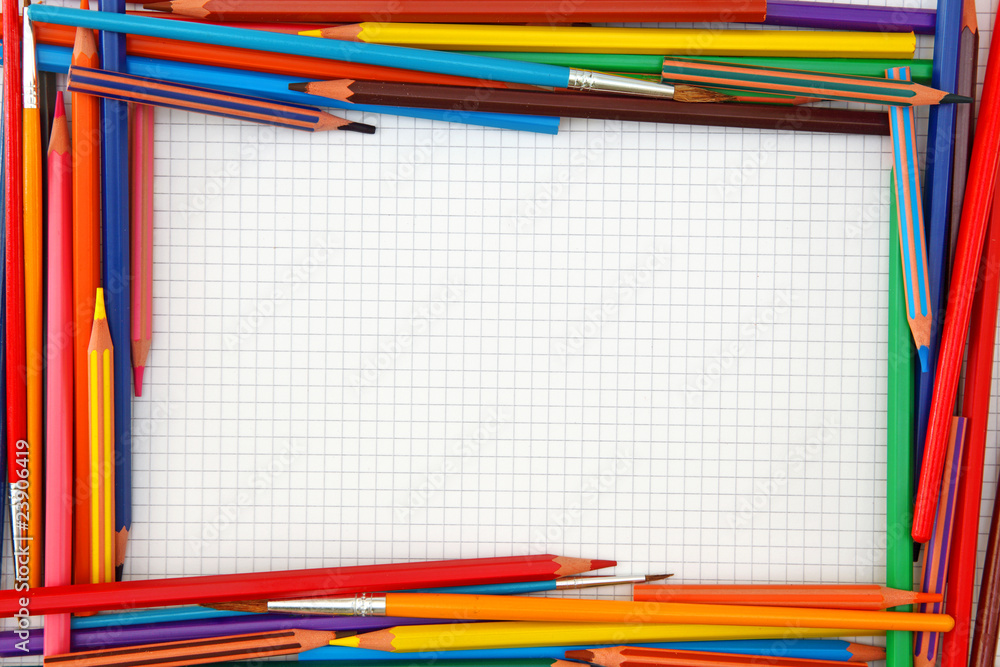 Colorful pencils frame on blank paper sheet
