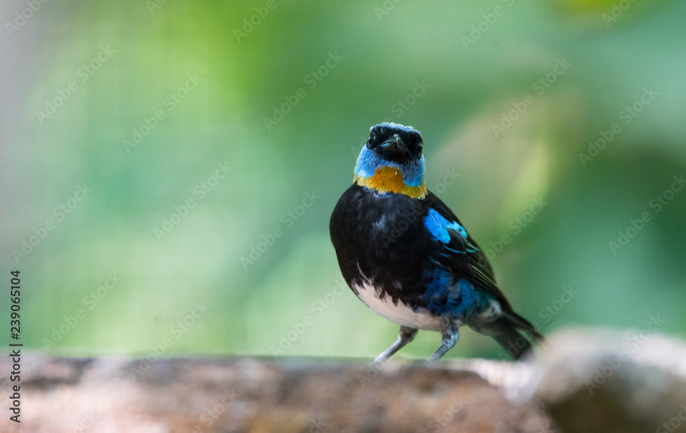 Golden hooded tanager (Tangara larvata) is a medium-sized passerine bird. Adult male has a golden head with black eyemask edged with violet blue above and below.