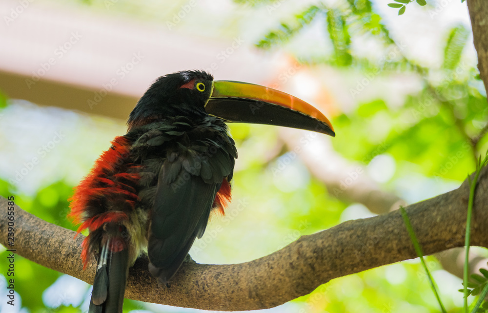 Happy and cheery Collared aracari (Pteroglossus torquatus) toucan is a near passerine bird.