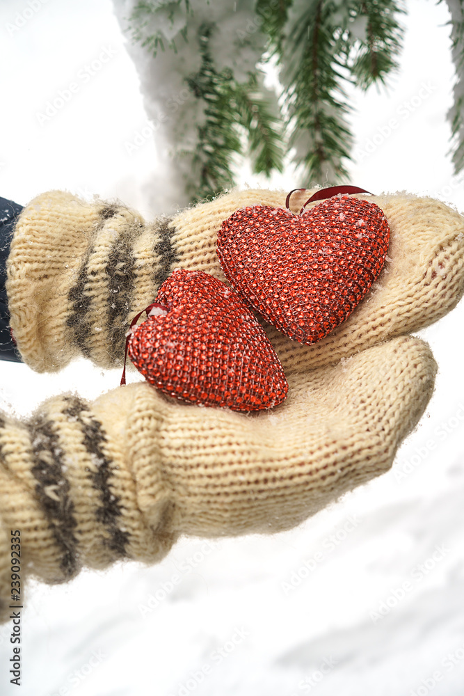 Two red textile hearts and hands in mittens on heavy snowy fir branch background, red brick house. Merry Christmas, Happy New Year and Valentine's Day greeting concept, coral color of heart, close up