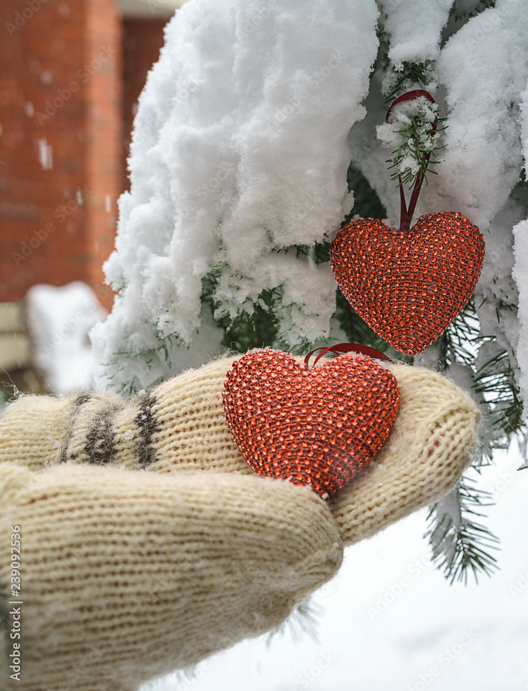 Two red textile hearts and hands in mittens on heavy snowy fir branch background, red brick house. Merry Christmas, Happy New Year and Valentine's Day greeting concept, coral color of heart, close up