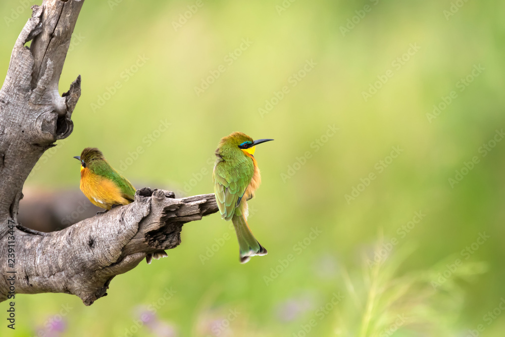 Little Bee eater bird in green orange perching at Serengeti National Park in Tanzania, Africa