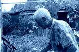 Happy senior man watering plants in the garden with a pocket gun on the hose