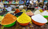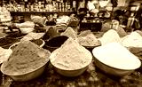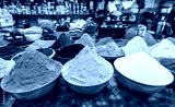 Spice store. Assortment of different colorful powder seasoning. Spices in store in the old city Aqaba. Jordan.