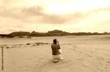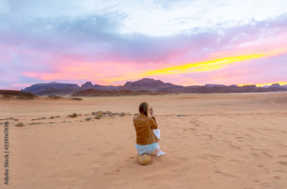 Back view of female tourist photographer taking picture of beautiful evening scenery of sunset in Jordan desert