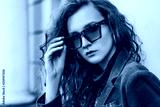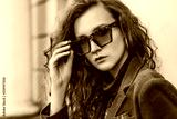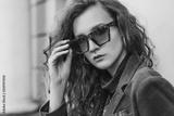Outdoor close up fashion portrait of young beautiful lady wearing leopard print sunglasses, brown corduroy blazer, green turtleneck, hoop errings, posing in street of european city. Copy space