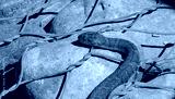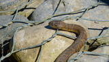 Northern water snake (Nerodia sipedon) large, nonvenomous, common snake in the family Colubridae, basks in sunlight on wired rocks.