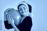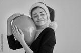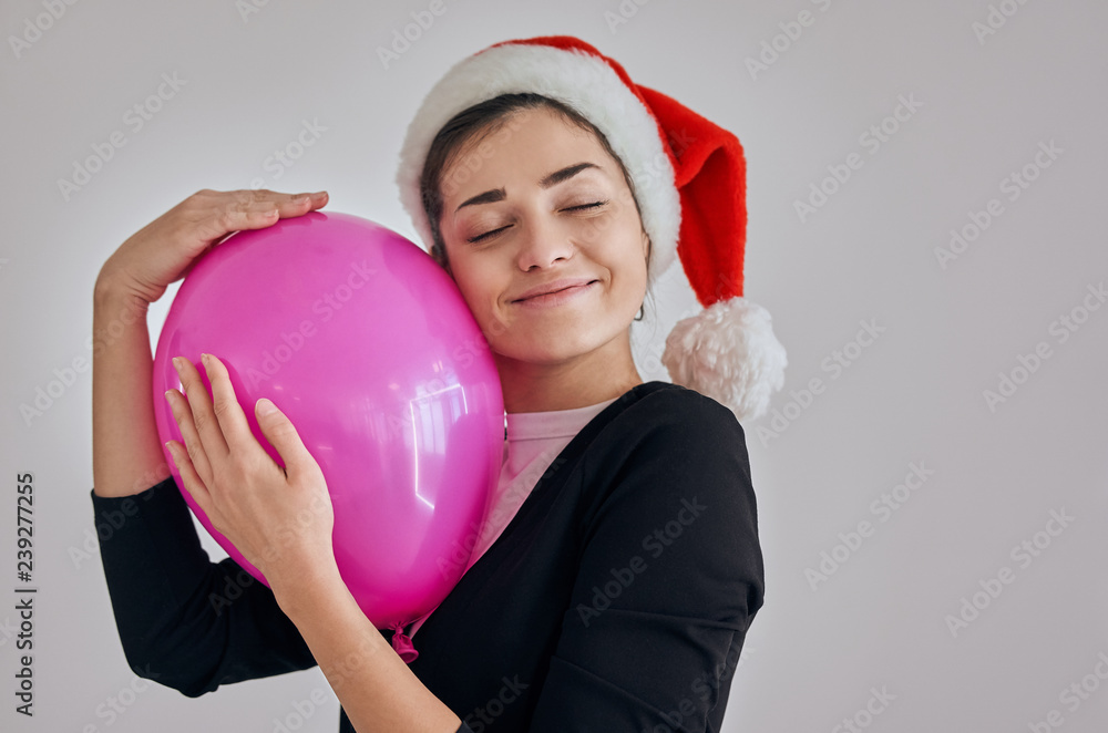 The happy woman in santa hat holding the balloon