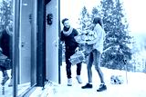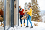 Young lovely couple dressed in colorful sweaters entering their modern home with firewoods in the mountains during the winter