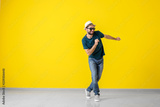 Handsome young man dancing near color wall