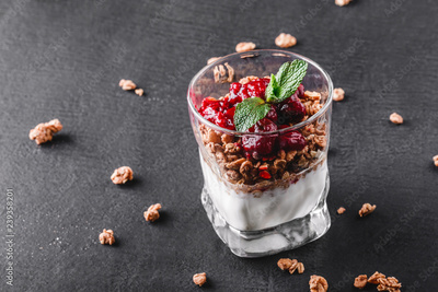 Delicious granola with yogurt and cherry in glass on black background. Healthy breakfast ingredients. Clean eating, vegan food concept. Top view