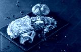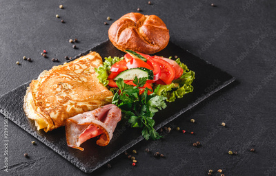 Breakfast, Omelette with bun, bacon, prosciutto, fresh salad and spices on stone board on black table surface. Healthy food, top view, flat lay