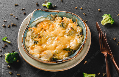 Vegetable Frittata with potato, broccoli, cheese in plate over dark background. Healthy vegan food, clean eating, dieting