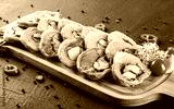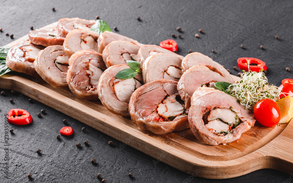 Assorted meat, stuffed chicken roll, meat roll with pepper, greens on cutting board on black shale background. Meat appetizer, food concept
