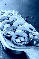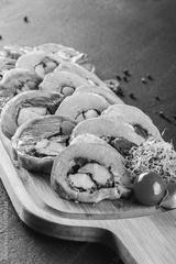 Assorted meat, stuffed chicken roll, meat roll with pepper, greens on cutting board on black shale background. Meat appetizer, food concept