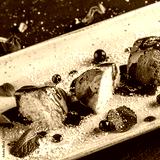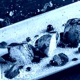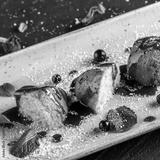 Homemade muffins with jam, blueberry and coconut in plate on dark stone background. Top view, Flat lay. Healthy breakfast