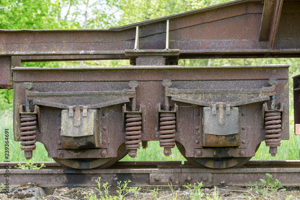 Old train and locomotive wheels. Railroad tracks stretches and green grass and trees. Railway road environment background.