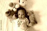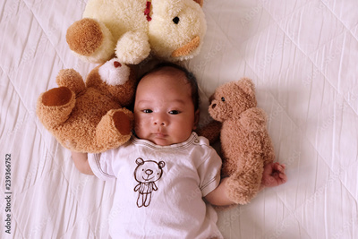Asian cute baby newborn smile and happy, good mood, on the bed with Teddy bear, Top view,