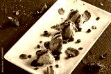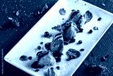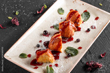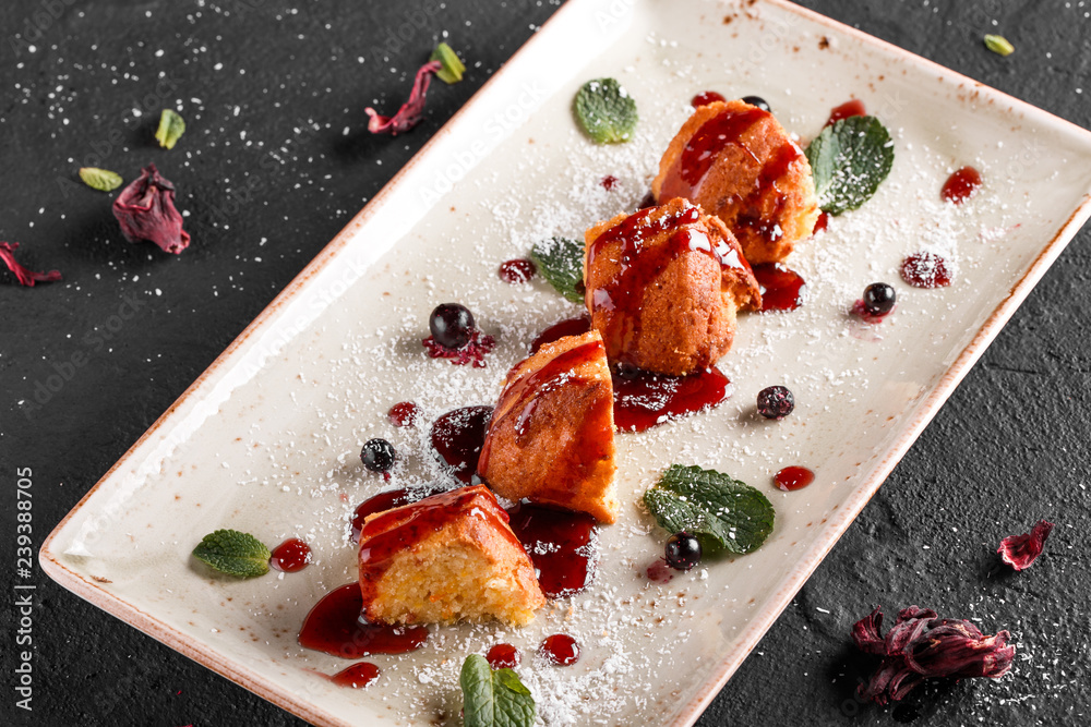 Homemade muffins with jam, blueberry and coconut in plate on dark stone background. Top view, Flat lay. Healthy breakfast