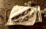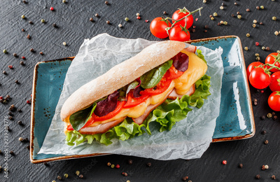 Fresh sandwiches with ham, cheese, bacon, tomatoes, lettuce in plate on dark stone background. Healthy lunch