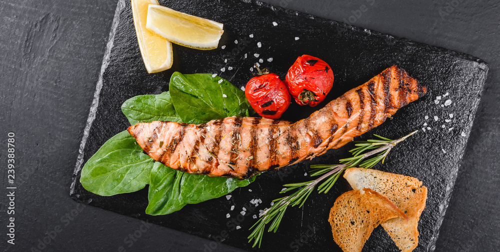 Grilled salmon fillet garnished with spinach, lemon, herbs on plate over wooden background. Hot fish dish. Top view, flat lay