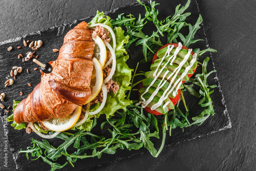 Croissant sandwich with tuna, avocado, fresh arugula and greens on black shale board over black stone background. Healthy food concept