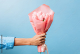 flowers in the hands of a man for Valentine's Day, on a blue background