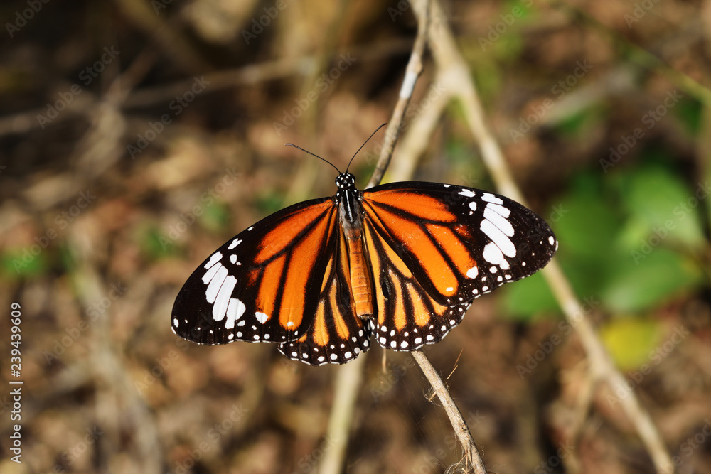The Common Tiger (Danaus genutia) butterfly at outdoors, Orange with white and black color pattern on insect wing, Monarch butterfly on tree in the field with natural brown background, Thailand