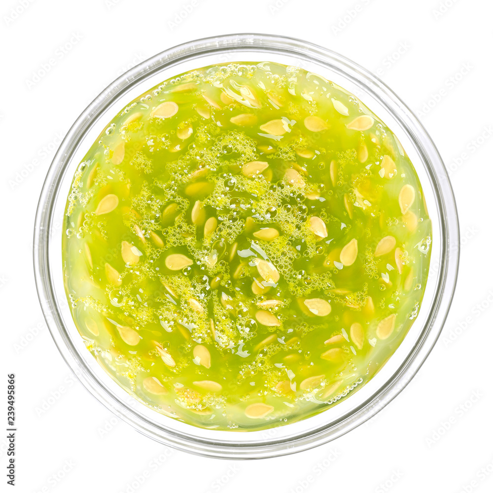 Kiwano pulp in glass bowl. Lime green, jelly-like flesh of horned melon, also African horned cucumber, jelly melon, hedged gourd or melano. Cucumis metuliferus. Macro food photo from above over white.
