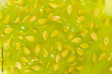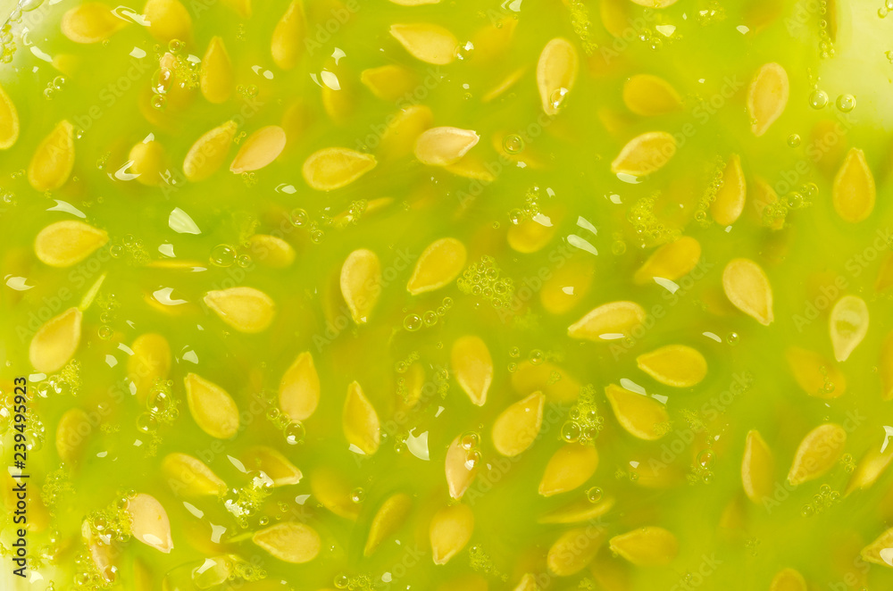 Kiwano pulp surface. Flesh of horned melon, close up and background. Lime green, jelly-like flesh of African horned cucumber, jelly melon, hedged gourd or melano. Cucumis metuliferus. Macro food photo
