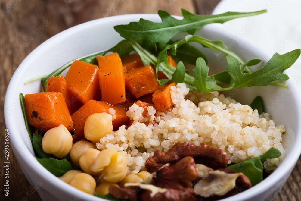 Healthy salad bowl with baked pumpkin, chickpeas, quinoa, arugula, walnuts