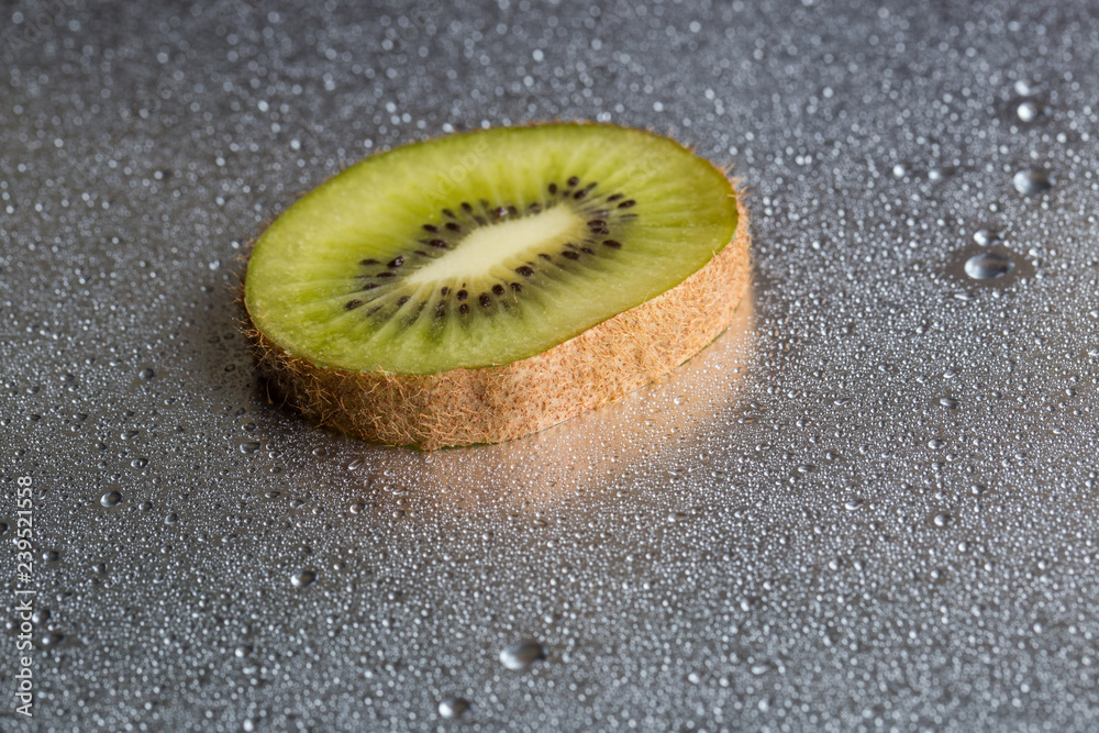 Kiwi closeup on a gray background with drops of water