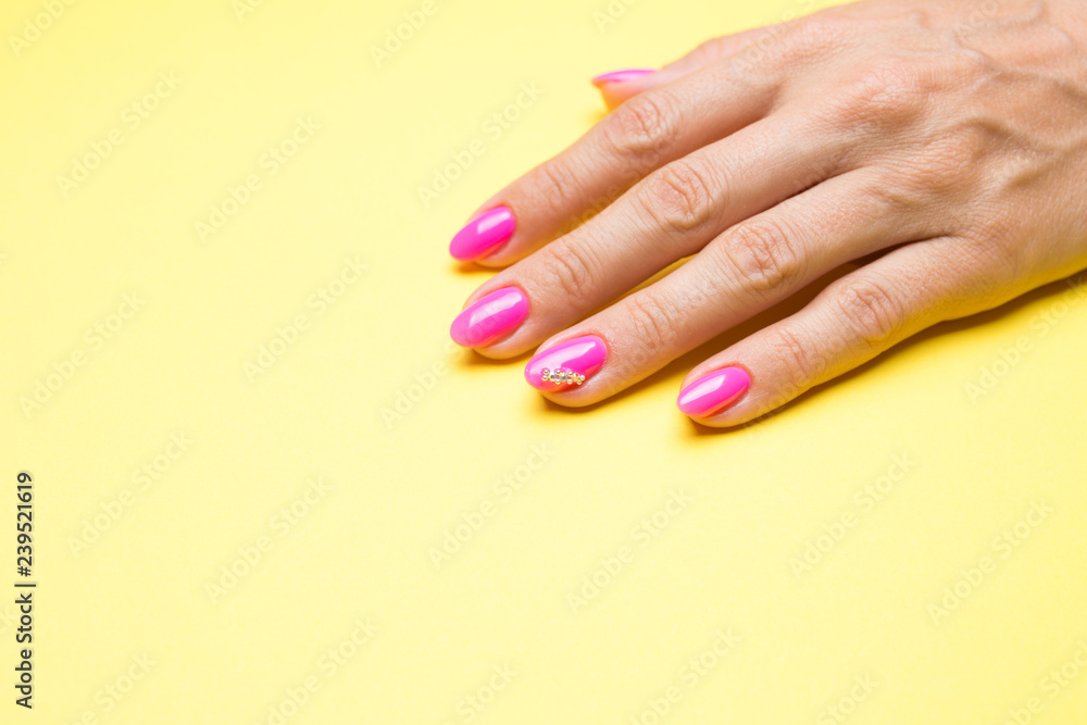 Stylish manicure pink on a yellow background