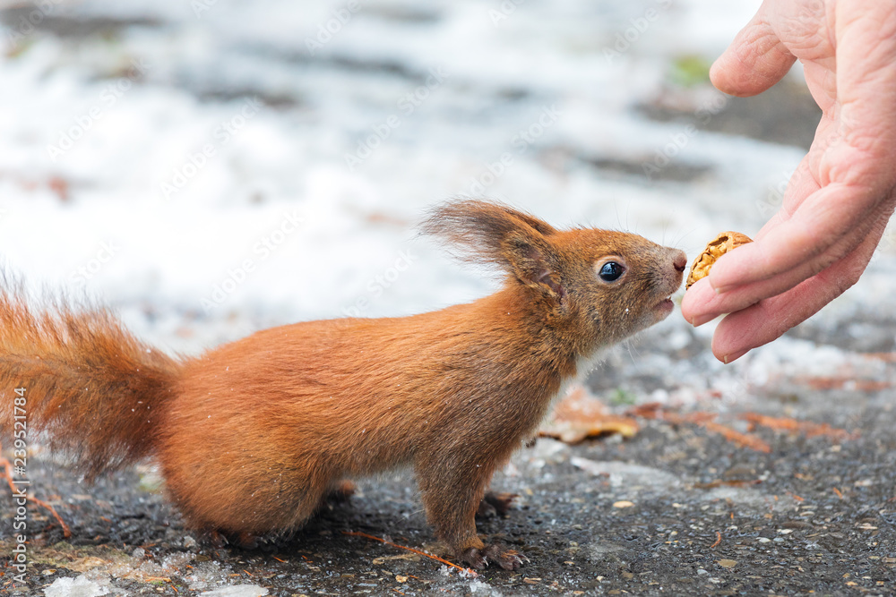 Eurasian red squirrel (Sciurus vulgaris) eating nuts from man hand