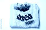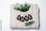 Cozy Winter Concept, Home Letters on Beige Knitted Sweater and Fir Branches, Top View