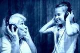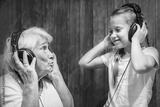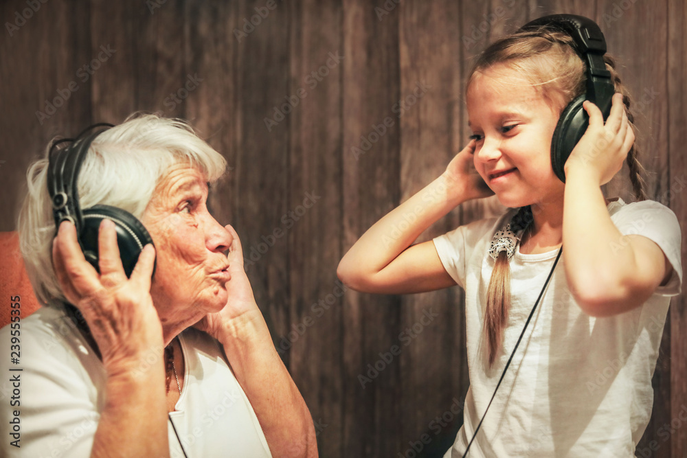 old woman and little girl in headphones listening to music grandmother and granddaughter
