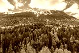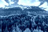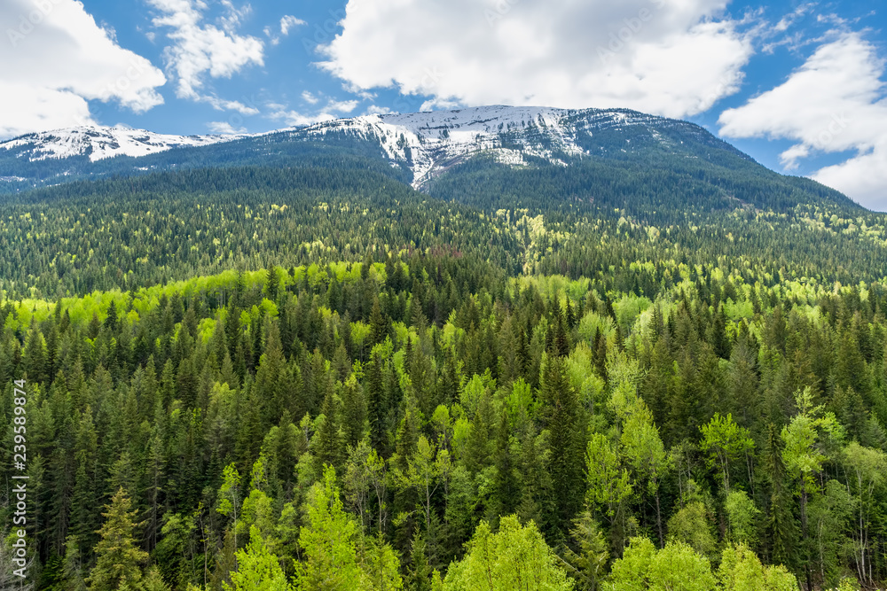 Colorful forest of British Columbia in spring with snowy mountains in background - Canada