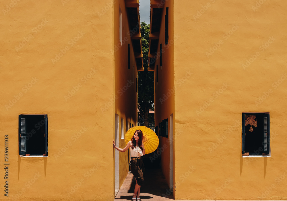 Thai woman in traditional dress holding a yellow umbrella walking with the yellow vintage building in Thailand