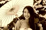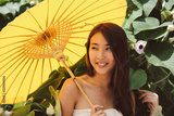 Thai woman in traditional dress holding a yellow umbrella walking