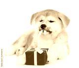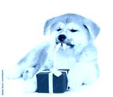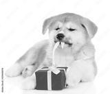 akita inu puppy unties the gift box ribbon. isolated on white background