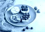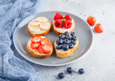Fresh healthy mini sandwiches with cream cheese, fruits and berries in grey plate with cloth. Strawberries, blueberries, bananas and raspberries on stone kitchen table background.Top view.