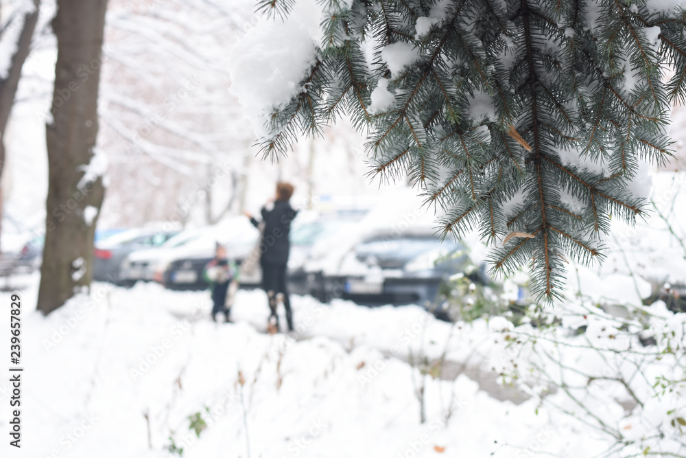 Frosty winter, pine branches covered with snow. Winter background with space for text