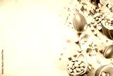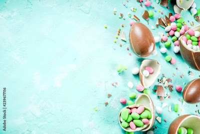 Colorful spring easter sweets background, with chocolate eggs, sugar sprinkles and marshmallow bunny, turquoise light blue concrete background copy space top view