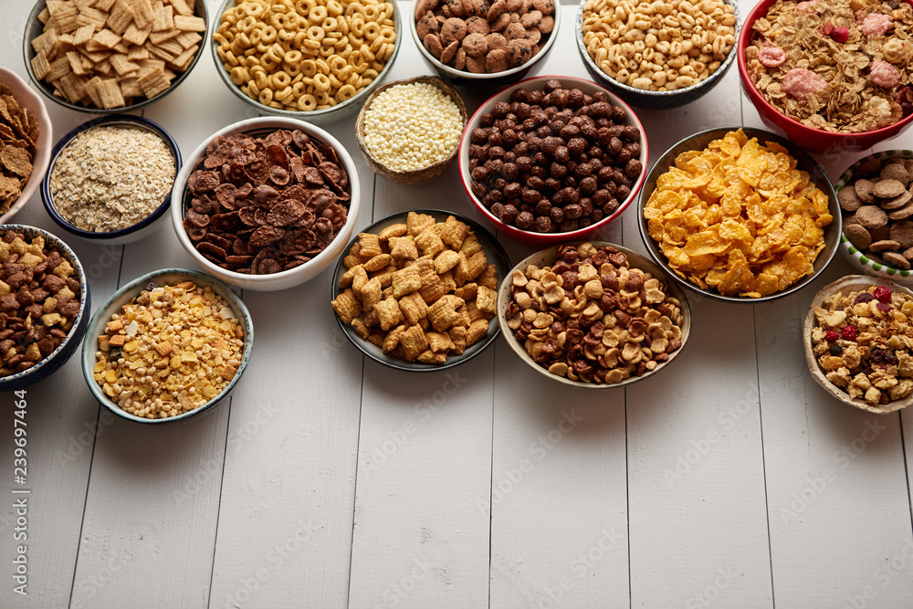 Assortment of different kinds cereals placed in ceramic bowls with cornflakes, granola, cereals and oatmeal. The concept of breakfast food. Flat lay, with copy space, top view on white wooden table.